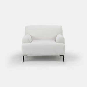 Softly rounded arms flow seamlessly into the seat edge. Low-profile cushioned seat paired with tapered metal legs for visual lightness. Fits modern minimalist or layered interiors.